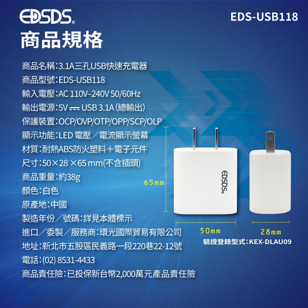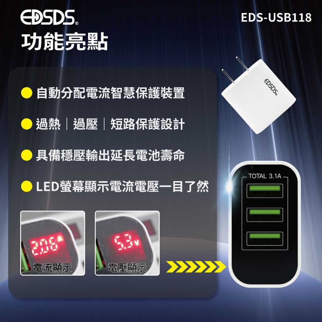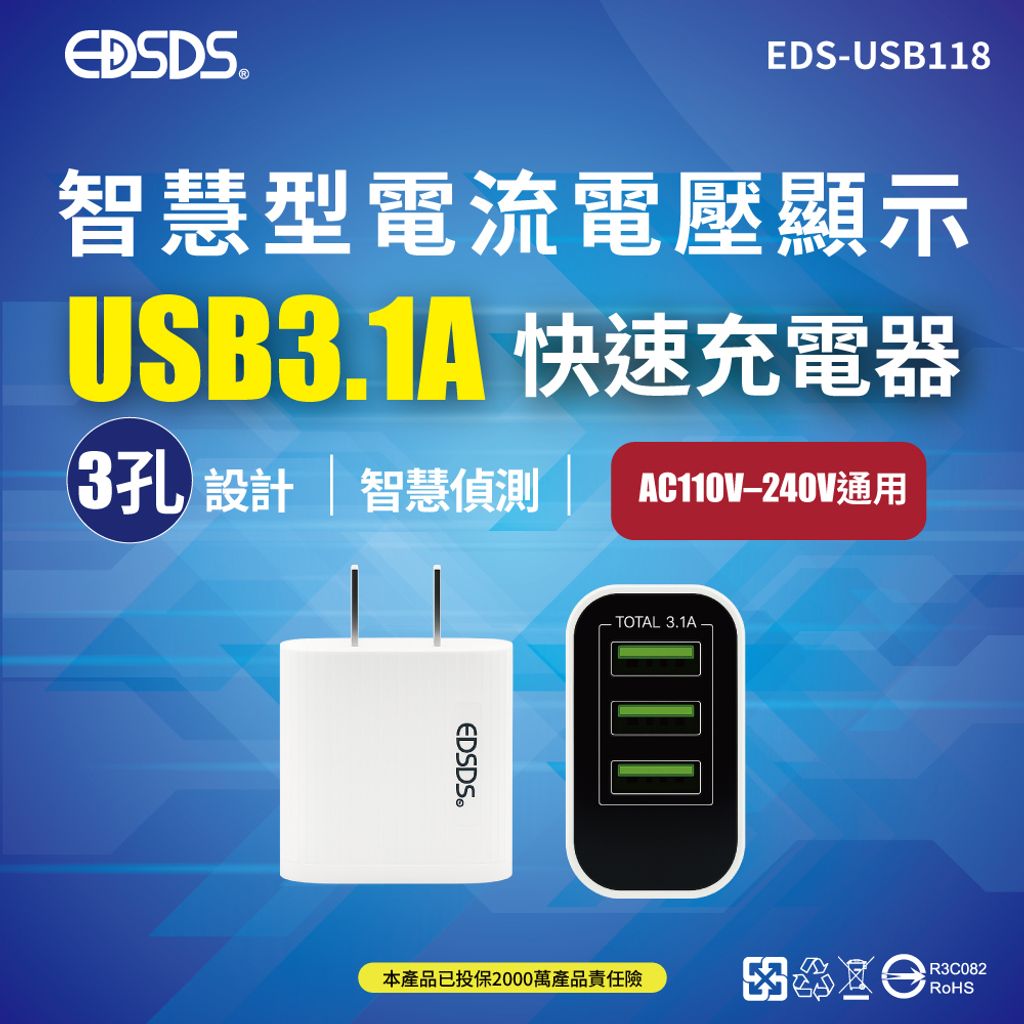 EDSDS愛迪生3.1A快速充電器(智慧型電流電量顯示)(EDS-USB118)