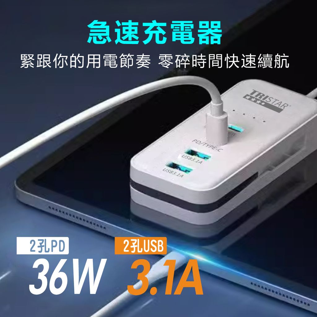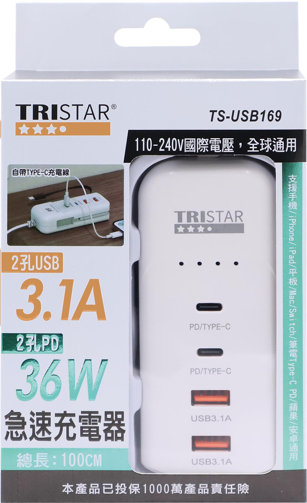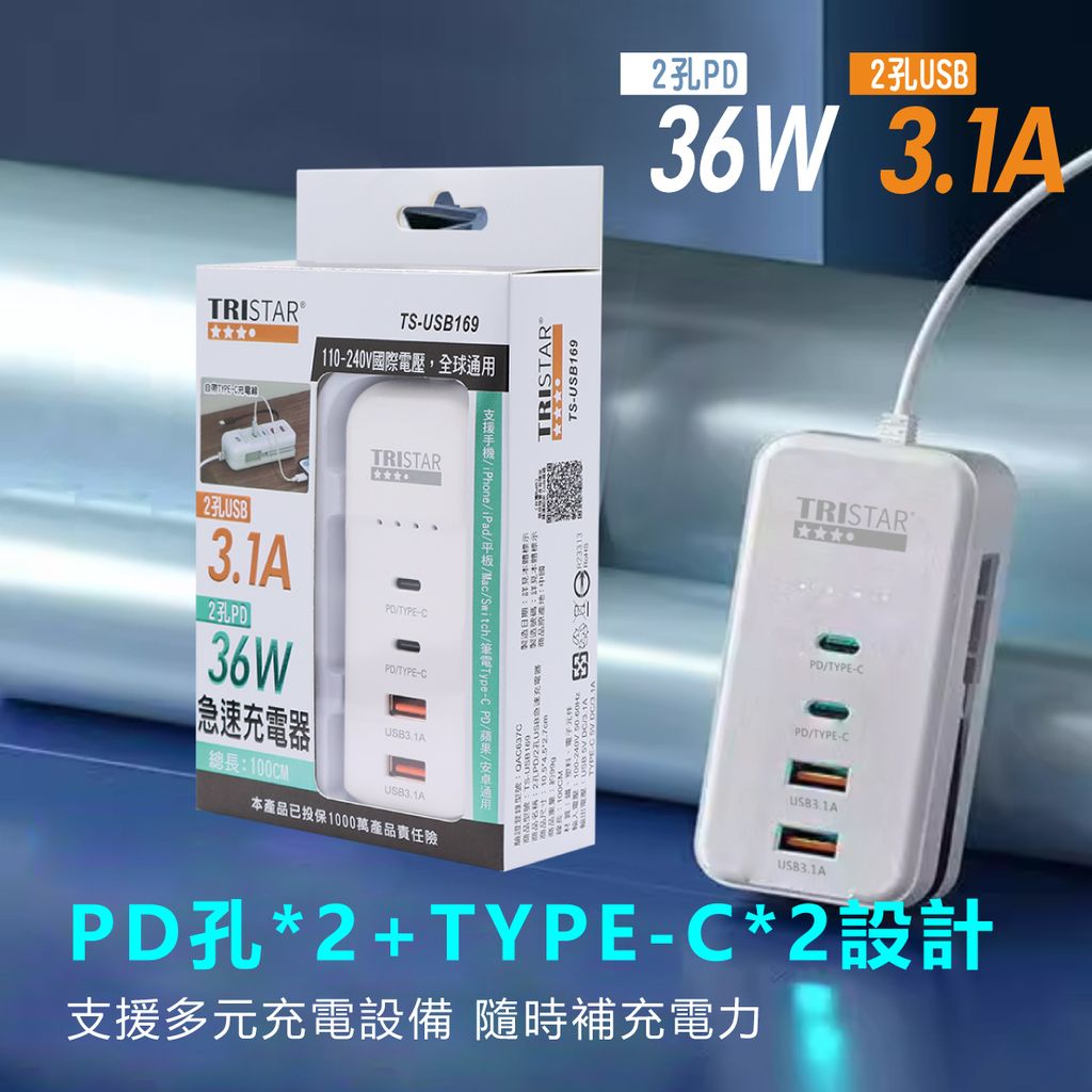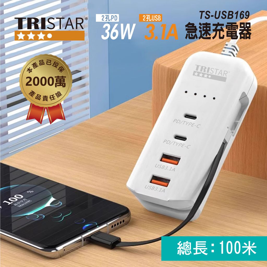 TRISTAR TS-USB169 急速充電器|2孔PD + 2孔USB|36W高效輸出 × 智能IC偵測 × 線長100cm